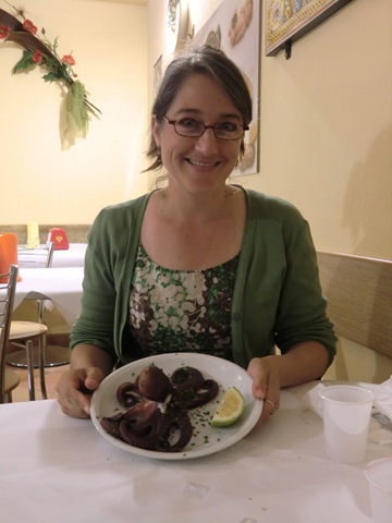 Our last meal in Sicily is at Spaghetti House. Salvatore, the owner of Le Oasi walks us to the restaurant and tells the owner to take good care of us. Almost everyone we have come across in our journey has been cheerful and helpful. The waiter tells us that he has very fresh polpo (octopus) for antipasto this evening. Lise orders boiled and I order fried. Donna just shakes her head. Lise’s arrives first. Now, we were all thinking it would be cut up pieces on a plate with a bit of sauce or something… but nooooo, what arrives is one boiled octopus on a plate… whole sitting up like a rubber toy.