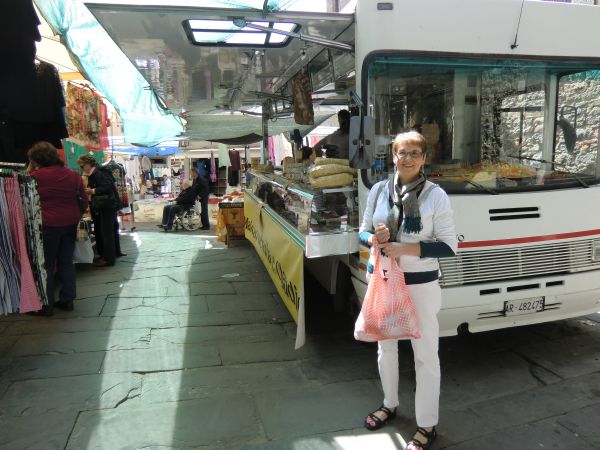 Saturday is market day in Cortona. We wander through the streets which are unrecognizable, crowded with trucks selling clothing, linens, leather goods and toys. There were trucks of fruits and vegetables and trucks that unfolded origami like into small meat and cheese shops. We were on a mission to stock up for the first night and morning in Greve. Cantaloup, cheese (creamy fresh peccorino that you can’t get in the US), a salami and some cherries from Puglia. (Not as good as Michigan cherries, but mighty tasty). We also got a quart of strawberries to put on breakfast. Donna used her super cool prize/shopping tote and we were off to gather our bags and be on our way.